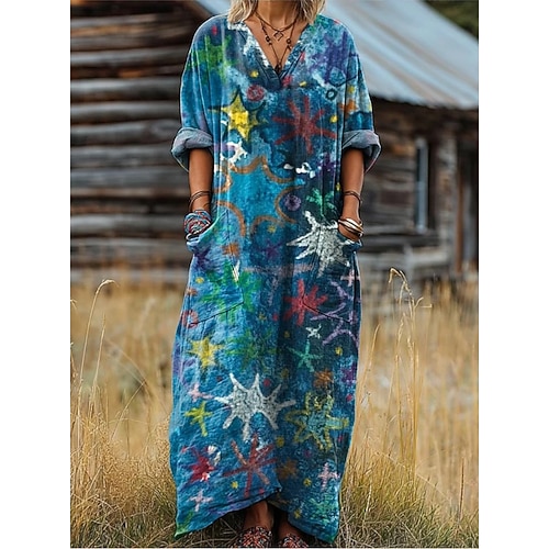 Per donna Abito maxi Abito a trapezio Vacanza Casual Quotidiano Vestibilità regolare Vestibilità comoda Floreale Grafico Manica Lunga Scollo a V Rosa Rosa scuro Rosso Blu Estate Primavera Autunno