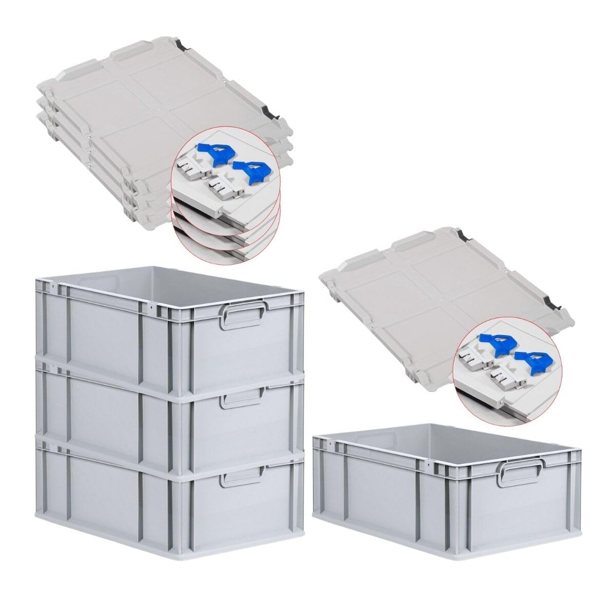 PROREGAL SuperSparSet 4x Eurobox NextGen Economy mit Scharnierdeckel & blauen Verschlüssen, Griffe zu, HxBxT 22x40x60cm, 44L, Eurobehälter, Box