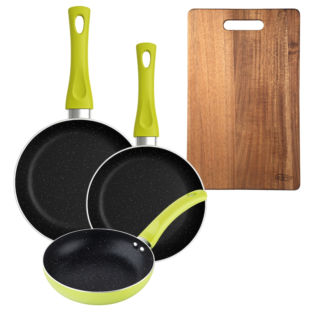 BERGNER - Set aus 3 Pfannen Ø20/Ø24/Ø28 cm gepresstes Aluminium Molen Grün Schneidebrett 40,3x25,2x2,5 cm aus Holz