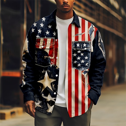 Giorno dell'indipendenza americana Per uomo Bandiera americana Bandiera Camicia Camicia con bottoni Manica lunga Informale Da tutti i giorni Per uscire Autunno Inverno Primavera estate Collo