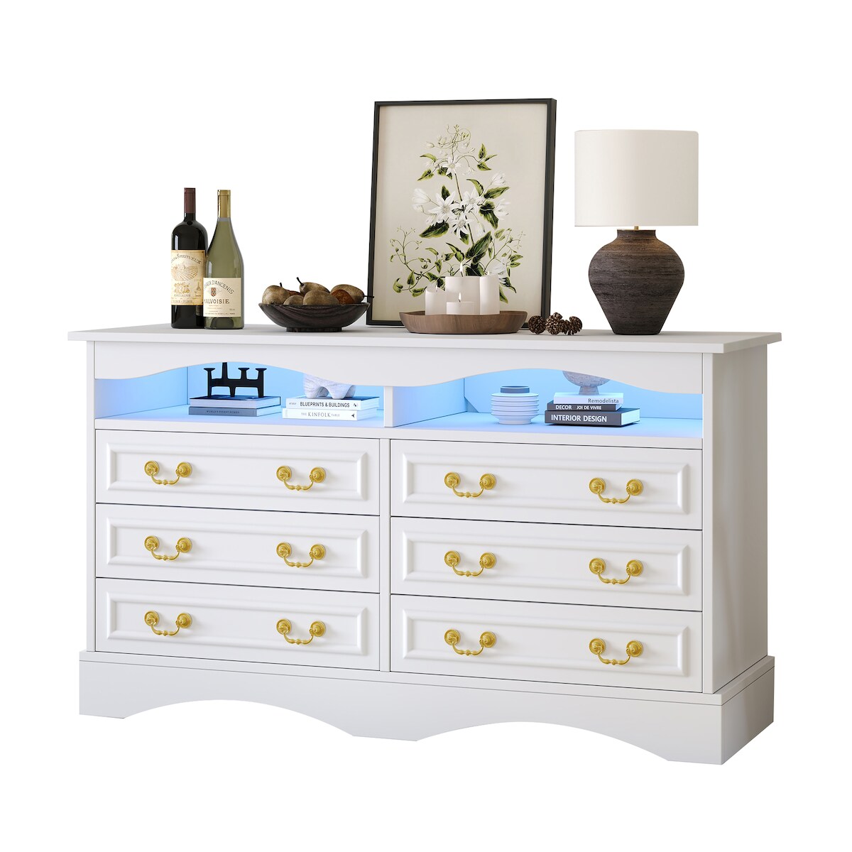 OKWISH LED Sideboard 120x40x70 cm Weiß mit 6 Schubladen, offener Ablagefläche, USB-Fernbedienung, LED-Lichtleiste, Stauraum für Wohnzimmer und Büro
