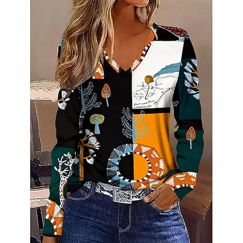 Natale Per donna Maglietta Grafico Natale Vintage Elegante Classico Manica Lunga Scollo a V Top Regolari Quotidiano Stampato Nero Vino Beige Primavera Autunno Inverno