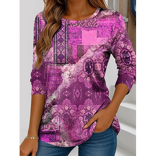Per donna Maglietta Floreale Grafico Moda Elegante Casual Manica Lunga Girocollo Top Regolari Quotidiano Weekend Stampato Blu Viola Arancione Estate Primavera