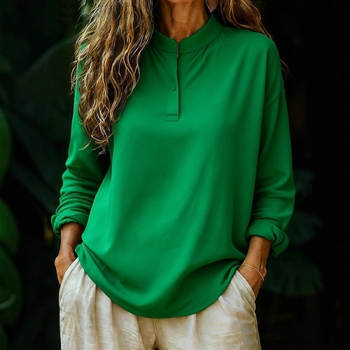Per donna Camicia Blusa Finto cotone e lino Semplice Elegante Moderno Manica Lunga Collo Alto Top Regolari Quotidiano Ferie Uscire Bottoni Bianco Rosa Rosso Verde Estate Primavera Autunno