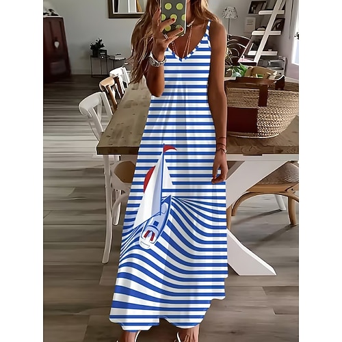 Per donna Abito maxi Abito a trapezio Abito Estivo Abito Sottoveste Vacanza Casual Spiaggia Vestibilità comoda Grafico Geometrico Senza Maniche Scollo a V Blu Estate Primavera