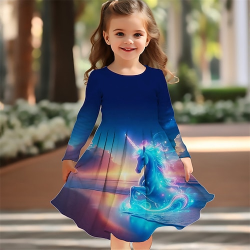 ragazze' 3D Unicorno Abito Manica Lunga Estate Primavera Vacanza Quotidiano Ferie Principessa Bello Dolce Bambini 4-12 Anni Vestito Casual Abito a trapezio Lunghezza al ginocchio Vestibilità regolare