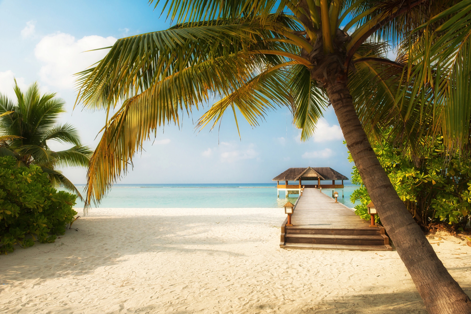 Fototapete PAPERMOON "PALMEN-STRAND-KARIBIK SÜDSEE MEER DÜNEN STEG SONNE", bunt, B:4,50m L:2,80m, Vlies, Tapeten