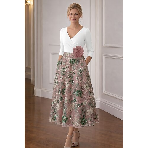 Linea ad A Lunghezza alla caviglia Lunghezza Tè Vestito da Festa Abito da Cocktail Abito da invitata a nozze Abito da cerimonia per signora Manica 3/4 Scollo a V Elegante Vintage Formale Cocktail