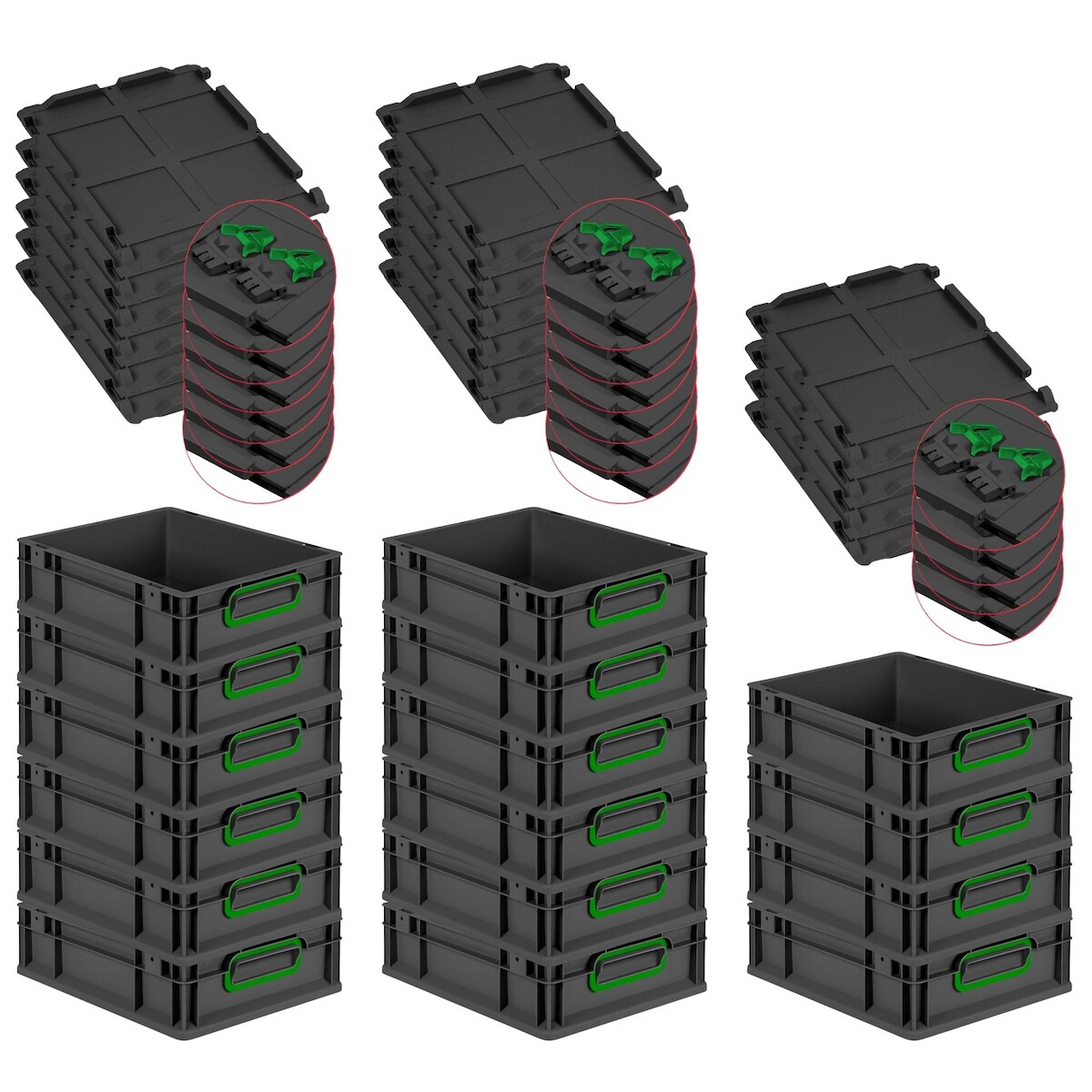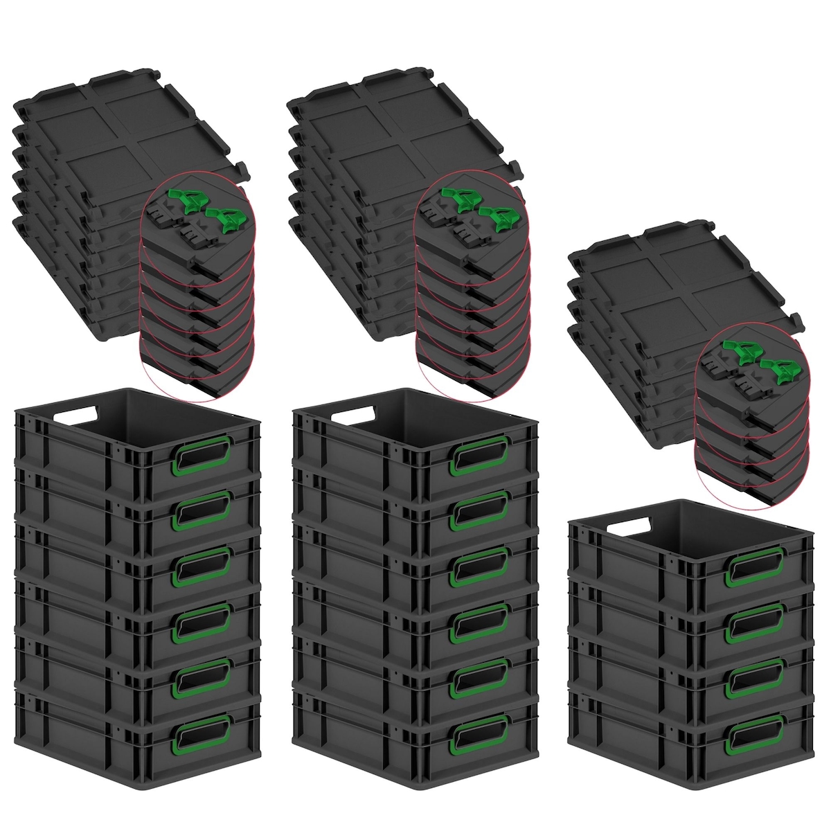 PROREGAL SuperSparSet 16x Eurobox NextGen Color mit Scharnierdeckel & Verschlüssen, HxBxT 12x30x40cm, 11L, Schwarz, Griffe grün zu, Eurobehälter