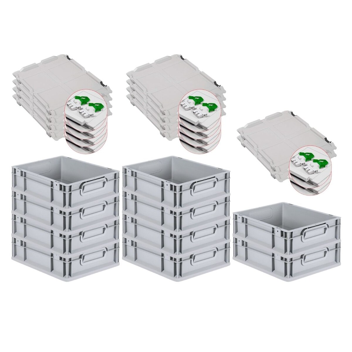 PROREGAL SuperSparSet 16x Eurobox NextGen Economy mit Scharnierdeckel & grünen Verschlüssen, Griffe offen, HxBxT 12x30x40cm, 11L, Eurobehälter, Box