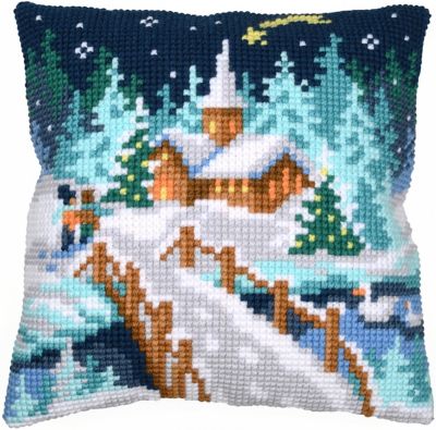 Coussin point de croix "village d'hiver de nuit"