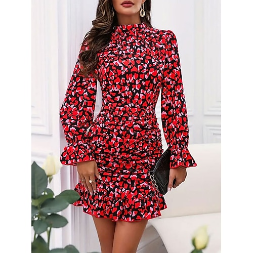 Per donna Mini Abito Tubino Casual Quotidiano Vestibilità regolare Floreale Manica Lunga Collo Alto Rosso Primavera Autunno