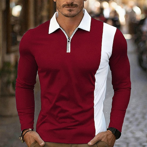 Per uomo Polo Polo con zip a un quarto Abbigliamento quotidiano Data Bavero Manica Lunga Moda Essenziale Blocco di colori Cerniera Primavera Autunno Vestibilità regolare Nero Bianco Vino Blu marino