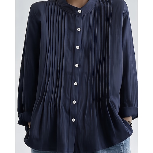 Per donna Blusa Semplice Casual Manica Lunga Girocollo Top Regolari Quotidiano Ferie Uscire Arricciato Bottoni Bianco Blu marino Estate Primavera