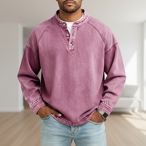 Per uomo Maglietta Maglia Henley Camicia di Jeans Camicia 100% cotone lavaggio acido Manica Lunga Semplice Vintage Streetwear Casual Lavato Manica corta Collo alla coreana Henley Casuale Streetwear