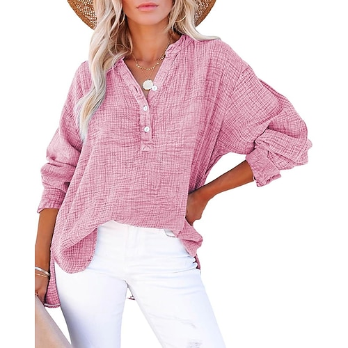 Per donna Blusa 100% cotone Semplice Vintage Elegante Casual Manica Lunga Scollo a V Top Regolari Quotidiano Ferie Uscire Bottoni Blu Bianco Verde chiaro Rosa Cammello Estate Primavera