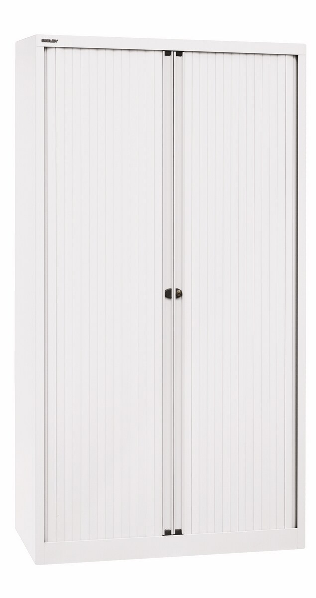 BISLEY Rollladenschrank mit Schloss in verkehrsweiß Schrank aus Metall Rollladen aus Kunststoff inkl. 4 Einlegeböden