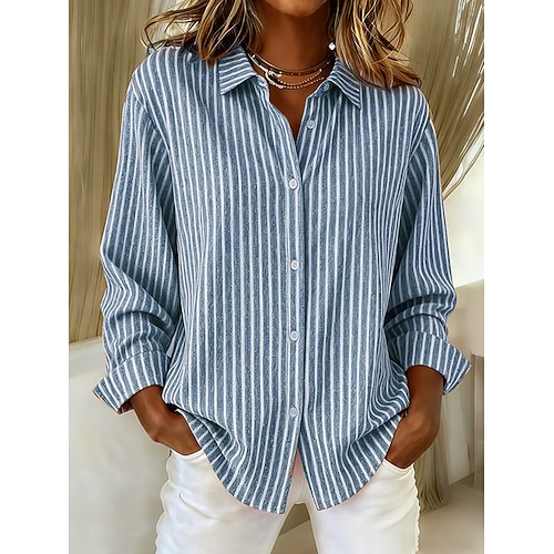 Per donna Top estivi Blusa Top Eleganti Grafico Semplice A righe Elegante Vintage Signore Manica Lunga Colletto a Camicia Top Regolari Quotidiano Lavoro Ferie Arricciato Patchwork Bottoni Blu Nero