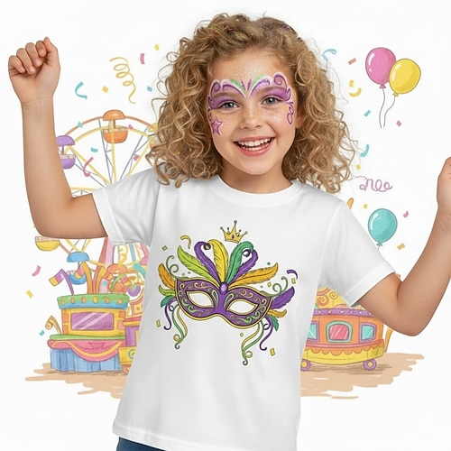 100% Cotone Carnevale di Martedì Grasso 2026 Bambini Ragazze Blu Nero Bianco Grafico Maschera Maglietta Girocollo Manica Corta Vacanza Sport Outdoor Abbigliamento Quotidiano Attivo Vacanza Casual