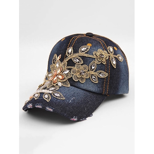 berretto da baseball da donna in denim decorato con fiori e dettagli in strass e perline – cappello casual alla moda per l'outdoor, l'uso quotidiano e l'estate