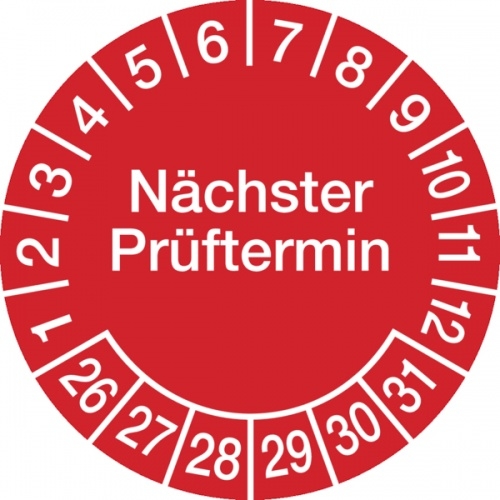 König Werbeanlagen Prüfplakette ab 26, Nächster Prüftermin, Jahresfarben, Folie, Ø 30mm - Bogen = 10 Stück - 30 mm Folie selbstklebend