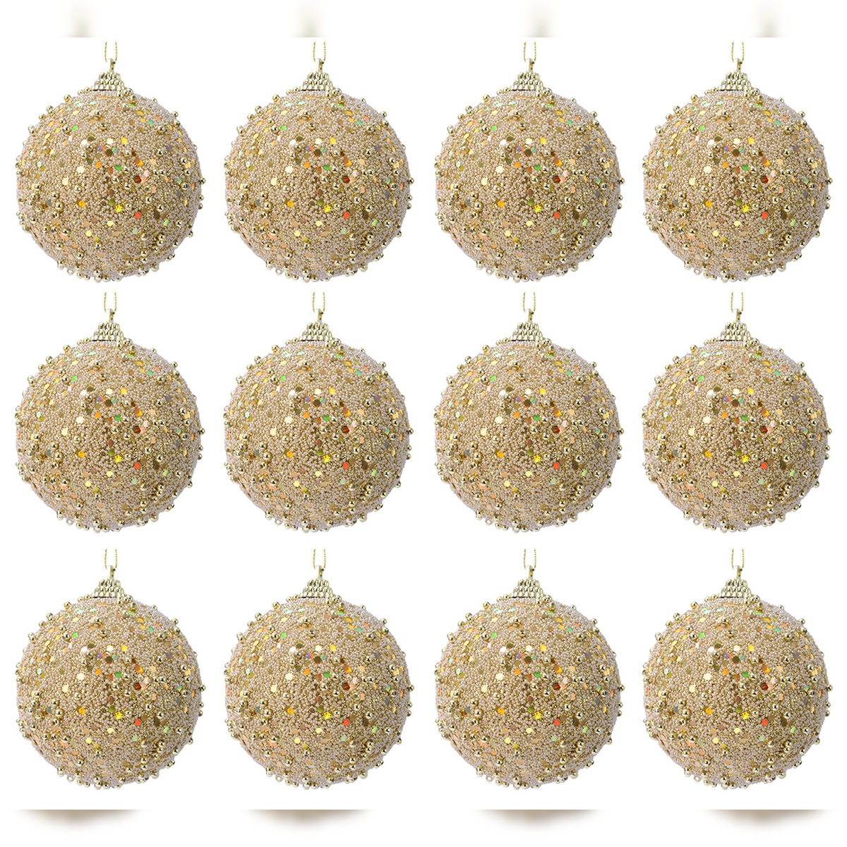 12 Weihnachtskugeln 8cm Kunststoff Perlen Pailletten Christbaumkugeln Set gold