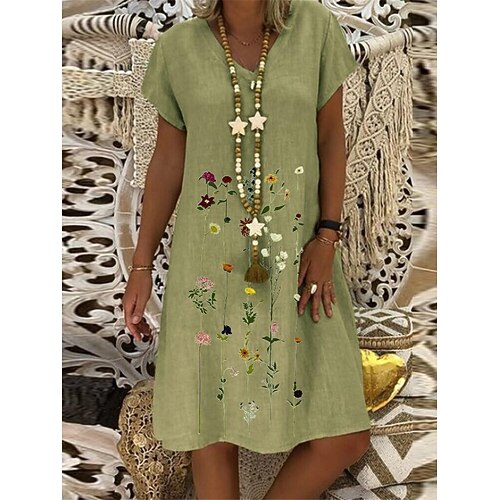 vestito estivo da donna con stampa botanica, scollo a V, manica corta, casual, largo, lunghezza al ginocchio, per uscite in spiaggia, per eventi diurni, bianco multicolore, comodo e traspirante,