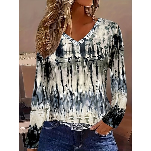 Per donna Maglietta Grafico Tinta a nodi Astratto Vintage Elegante Classico Manica Lunga Scollo a V Top Regolari Quotidiano Stampato Blu marino Primavera Autunno Inverno