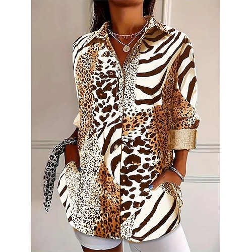 Per donna Camicia Grafico Leopardo Elegante Bohemien Vintage Manica Lunga Colletto a Camicia Top Regolari Lavoro Quotidiano Bottoni Stampato Giallo Blu Marrone Primavera Autunno Inverno Primavera