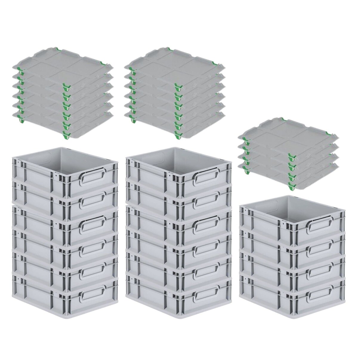 PROREGAL SuperSparSet 16x Eurobox NextGen Grip mit Auflagedeckel & 4 grünen Verschlüssen, HxBxT 12x30x40cm, 11L, Grau, Griffe zu, Eurobehälter