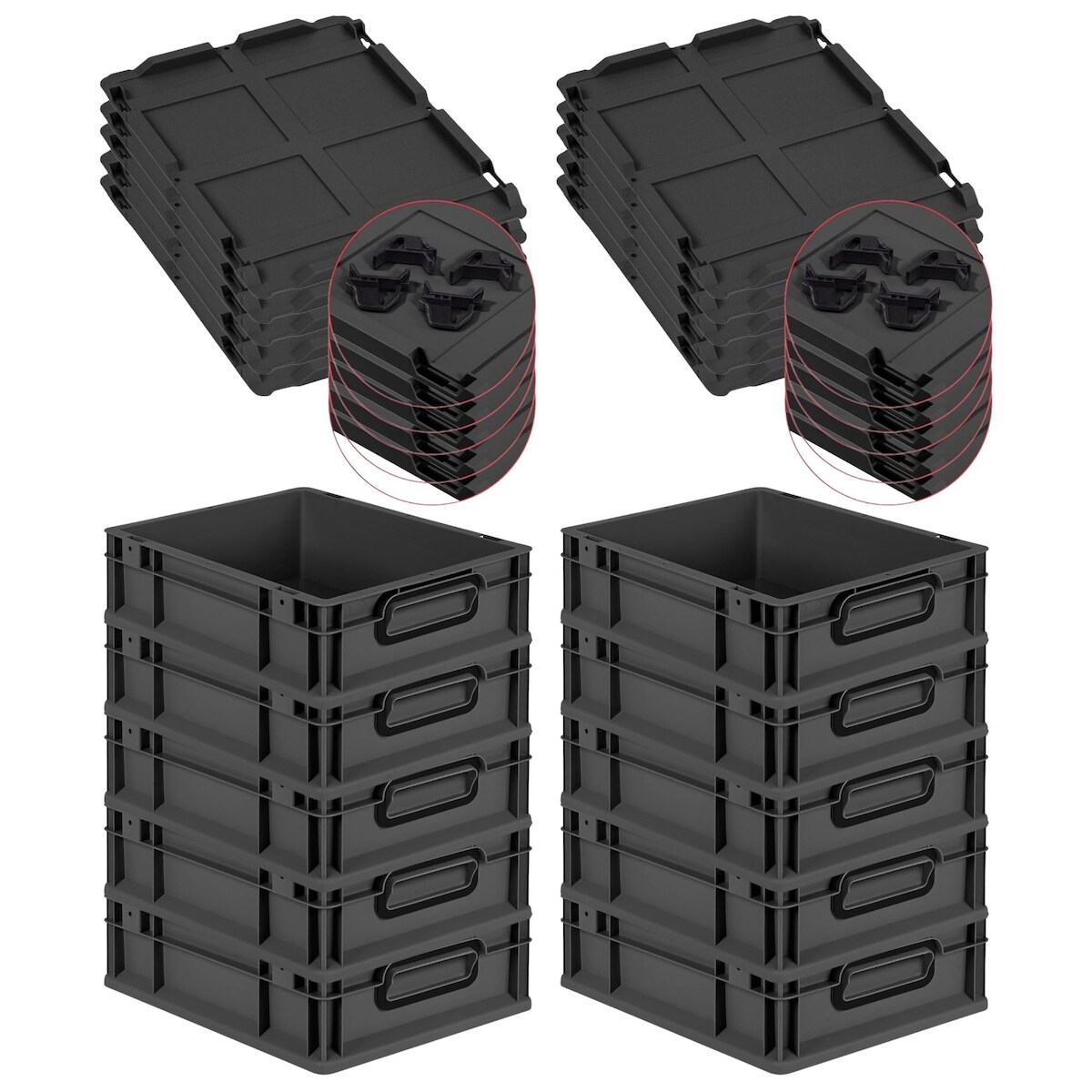 PROREGAL SparSet 10x Eurobox NextGen Color mit Auflagedeckel & Verschlüsse, HxBxT 12x30x40cm, 11L, Schwarz, Griffe schwarz zu, Eurobehälter