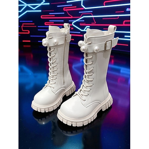 Scarpe da costume da pop star ispirate agli idoli coreani per bambini: stivali in similpelle nera con perle e fiocchi, perfetti per travestimenti, spettacoli teatrali e sfilate di moda