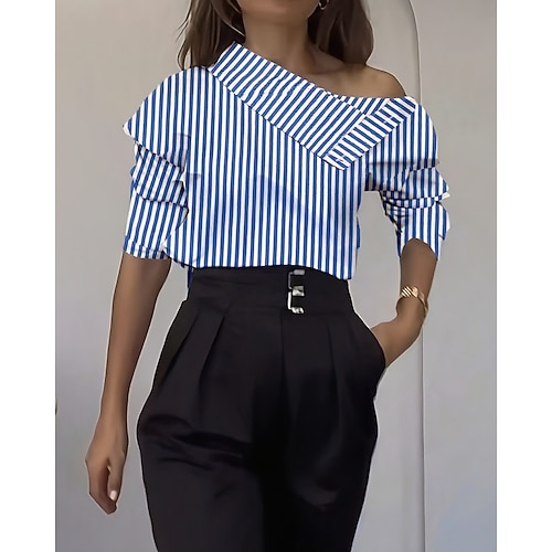 Per donna Camicia Blusa A righe Elegante Manica Lunga Dolcevita Top Regolari Quotidiano Ferie Uscire Bottoni Blu Estate Primavera