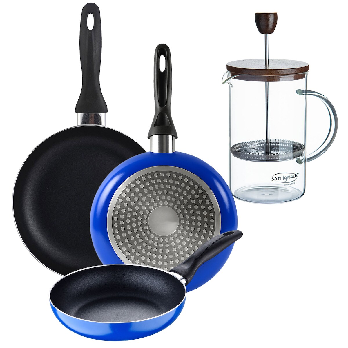 BERGNER - Set aus 3 Pfannen Ø16/20/24cm gepresstes Aluminium, geeignet für Induktion Blue Navy Paradise Stempel-Kaffeemaschine aus Borosilikatglas