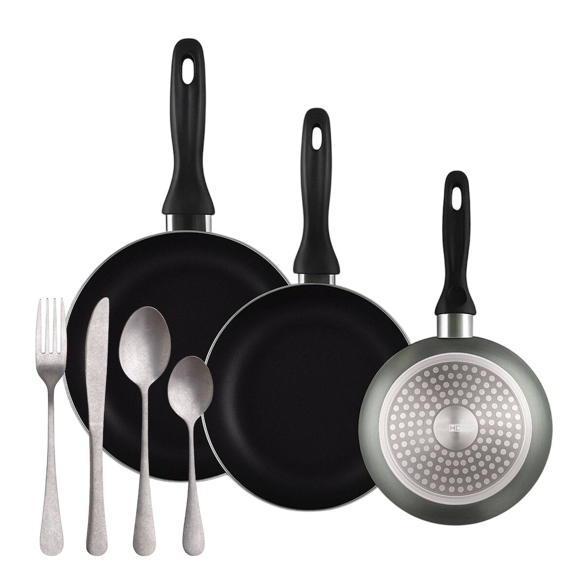 BERGNER - Set aus 3 Pfannen Ø16/20/24cm aus gepresstem Aluminium in metallic-grau mit 2-teiliges Küchenutensilien-Set EXCALIBUR