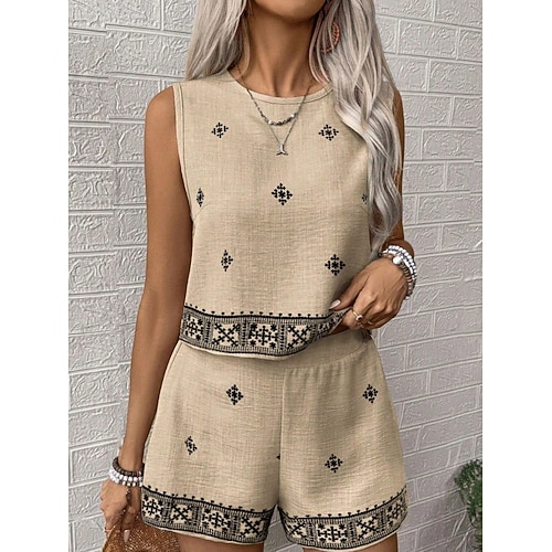 Completi di Pantaloni Corti in Lino Falso per Donna Set senza Maniche Collo Rotondo Stampa Geometrica Elegante Moda Streetwear Casual Giornalieri all'Aperto Blu Verde Khaki Estate Vestibilità Regolare