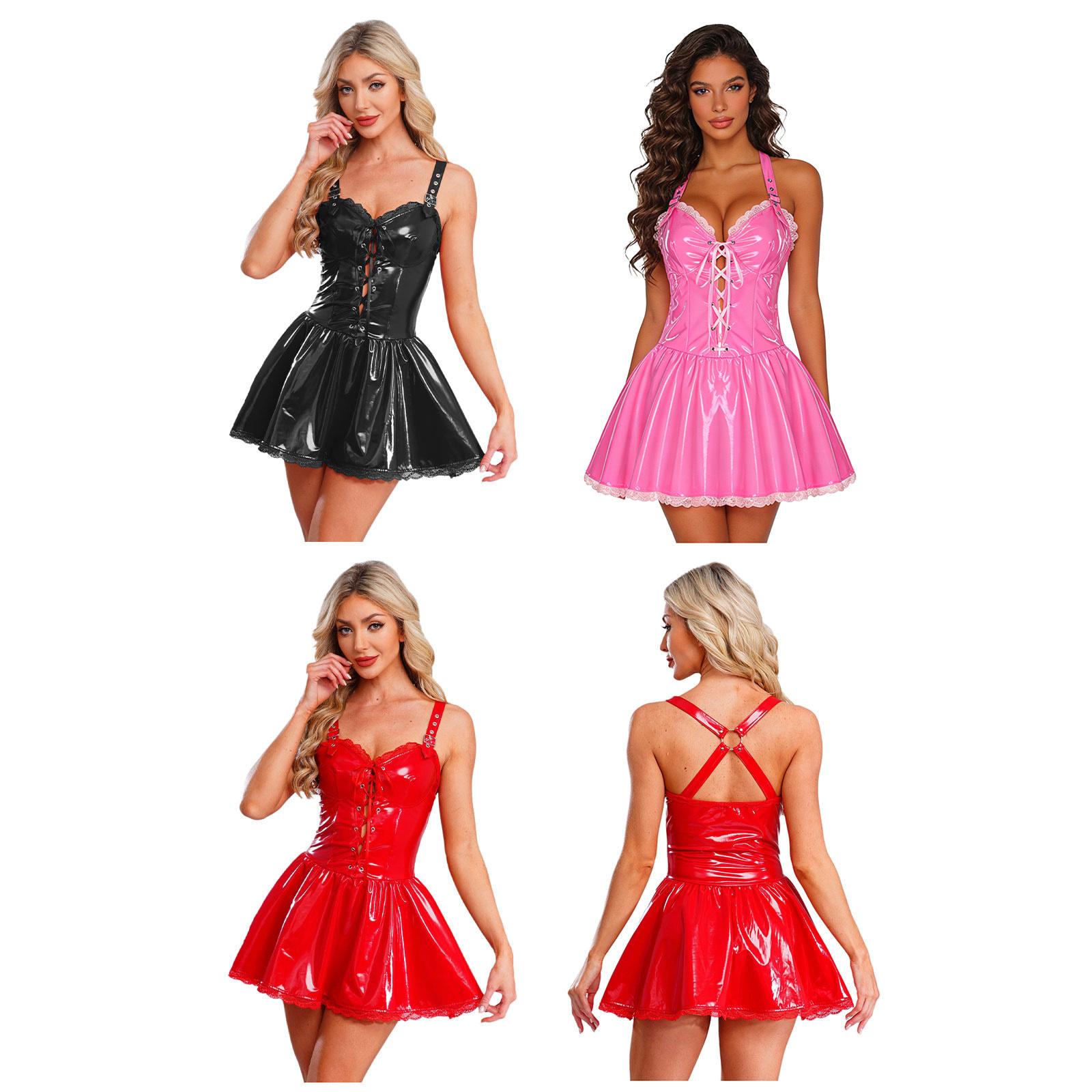 Robe brillante pour femme en similicuir à lacets sur le devant, dos croisé, coupe évasée, tenue de soirée cm rose