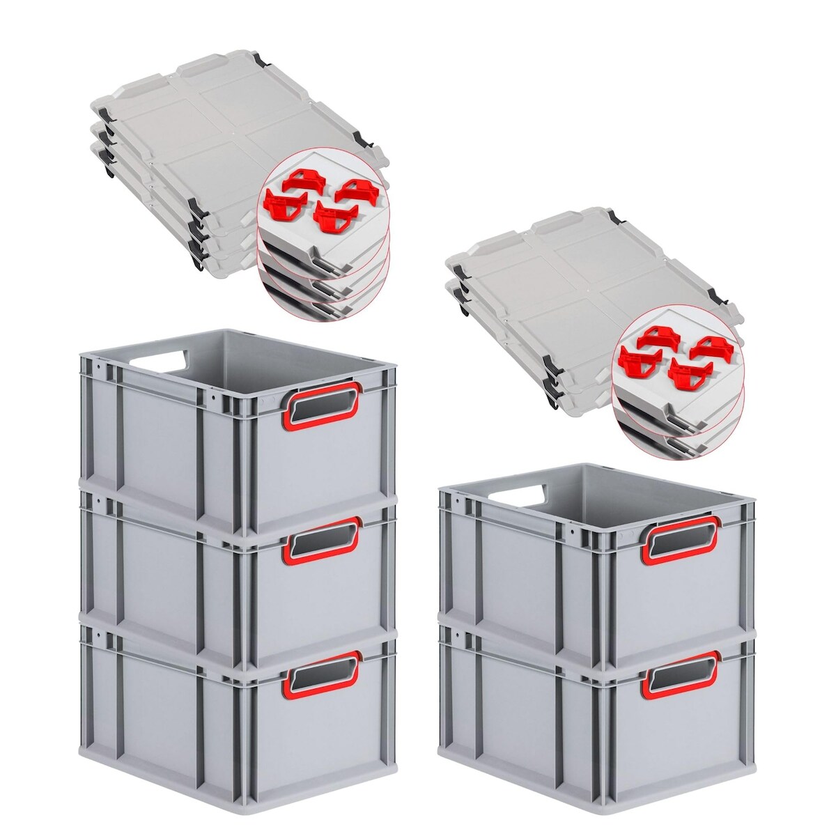 PROREGAL SparSet 5x Eurobox NextGen Color mit Auflagedeckel & Verschlüsse, HxBxT 22x30x40cm, 20L, Grau, Griffe rot offen, Eurobehälter, Box