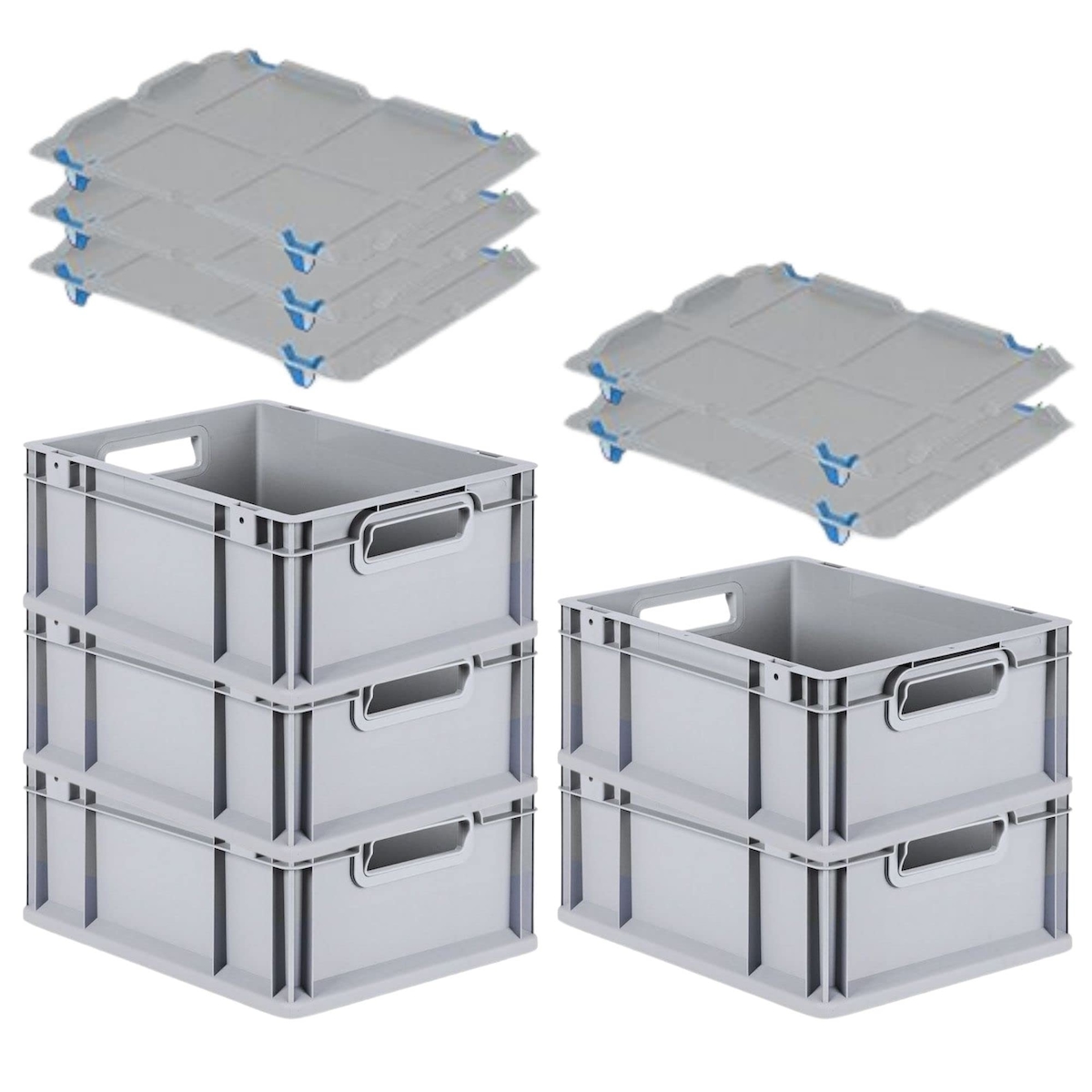 PROREGAL SparSet 5x Eurobox NextGen Color mit Auflagedeckel & Verschlüsse, HxBxT 12x30x40cm, 11L, Grau, Griffe blau offen, Eurobehälter, Box