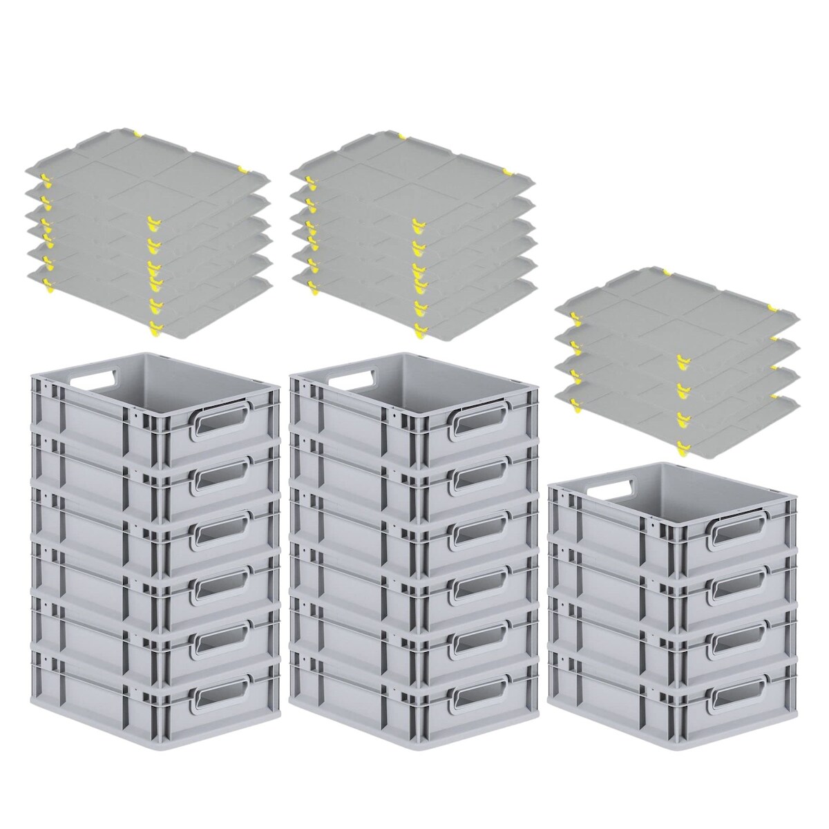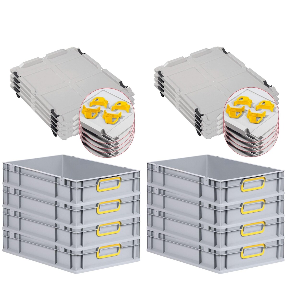 PROREGAL SuperSparSet 8x Eurobox NextGen Color mit Auflagedeckel & Verschlüsse, HxBxT 12x40x60cm, 23L, Grau, Griffe gelb zu, Eurobehälter, Box