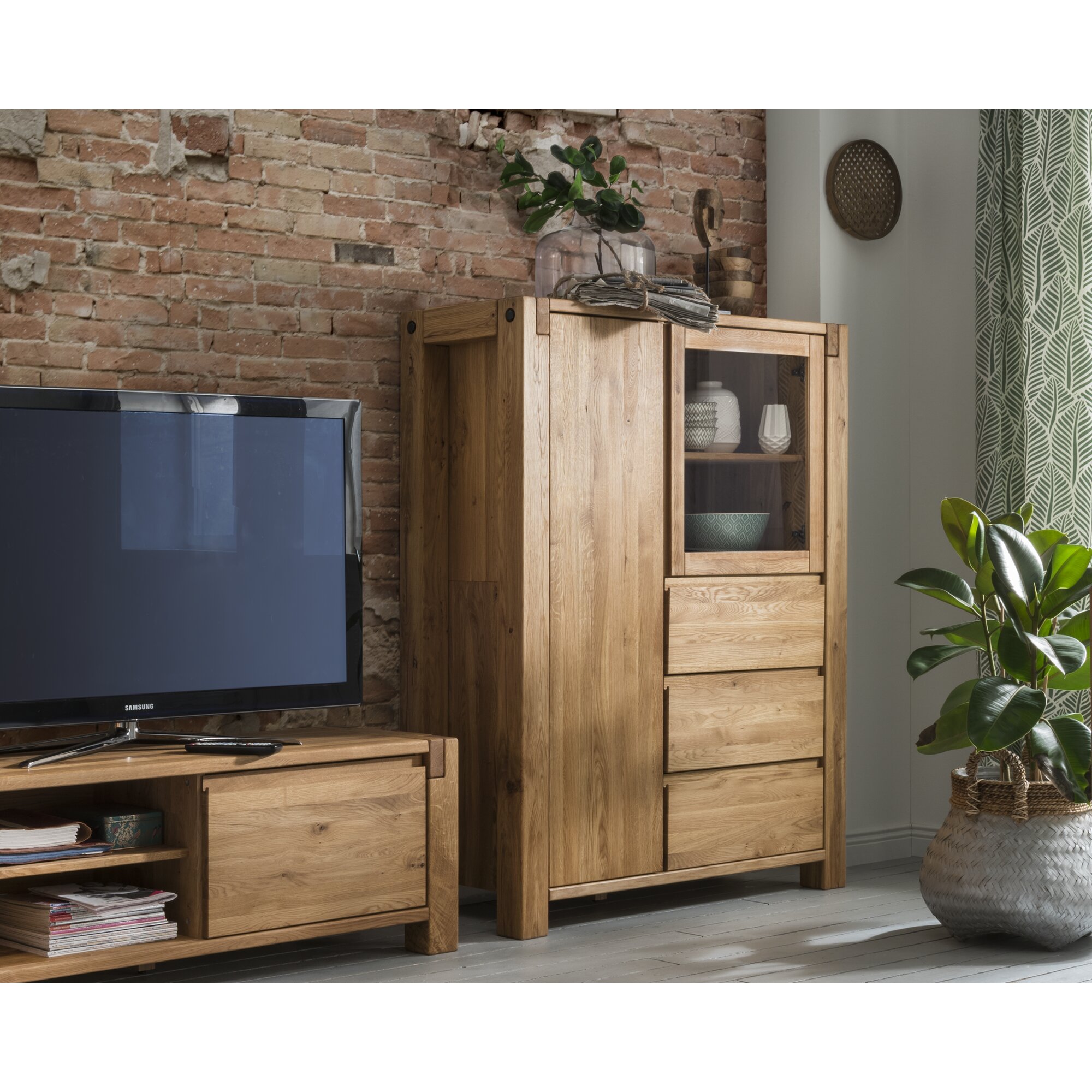 Massivholz »Woodstock« Highboard mit großer Glastüre links und 3 Schubladen
