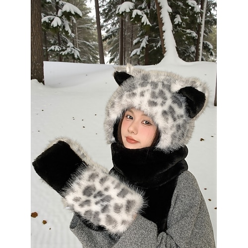 Set da donna con stampa leopardata, composto da cappello, sciarpa e guanti, 3 pezzi: caldo cappello invernale in pile con paraorecchie e guanti, accessorio in pelliccia elegante e caldo per
