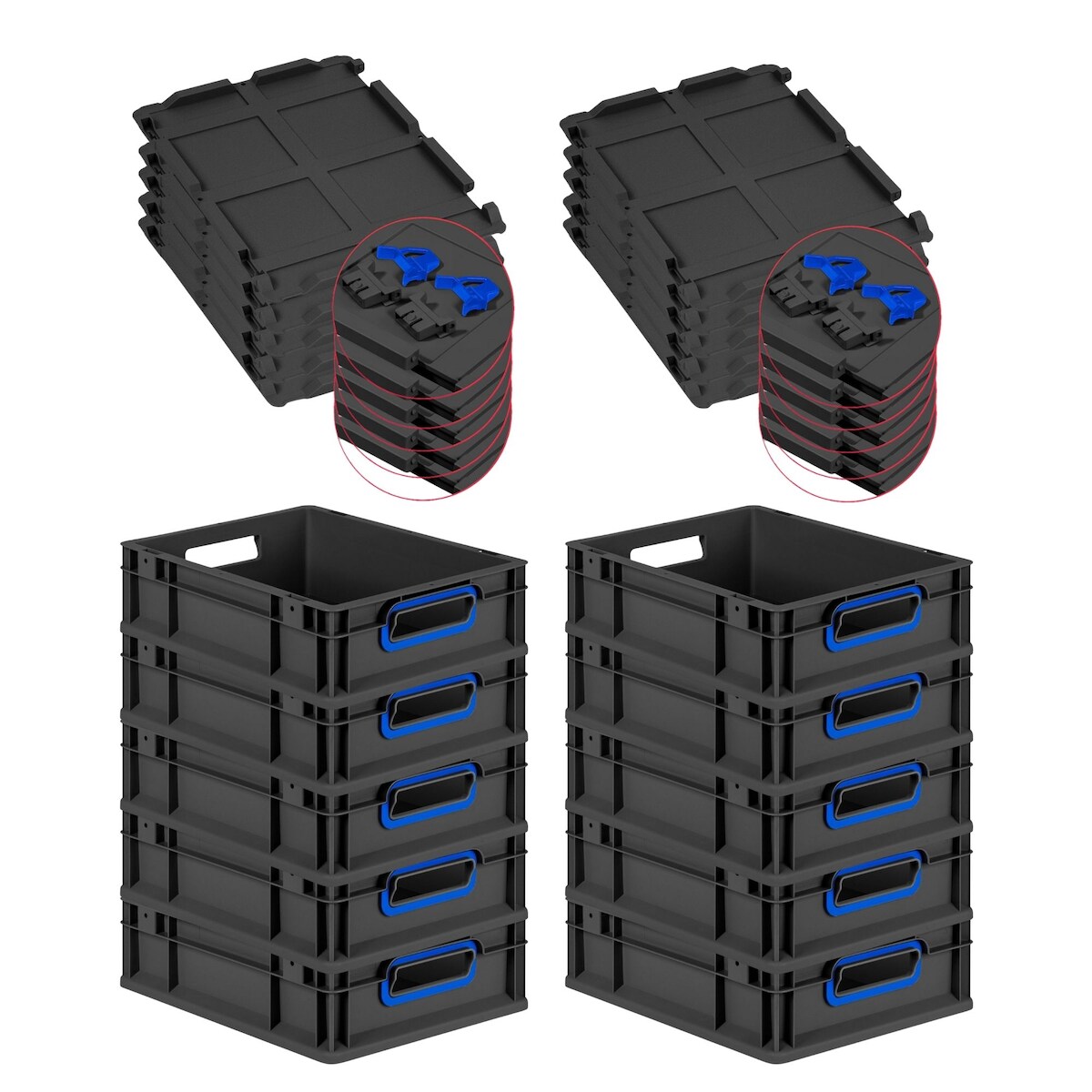 PROREGAL SuperSparSet 10x Eurobox NextGen Color mit Scharnierdeckel & Verschlüssen, HxBxT 12x30x40cm, 11L, Schwarz, Griffe blau offen, Eurobehälter