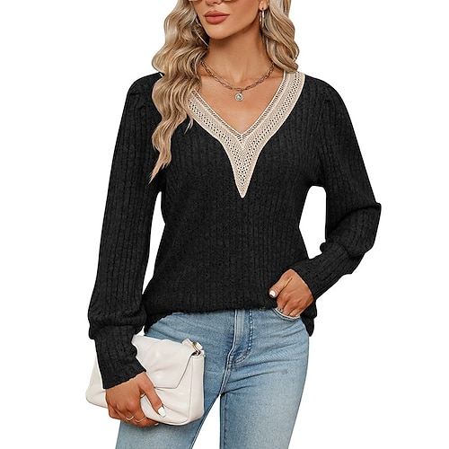 Per donna Felpa Maglione Quotidiano Elegante Casual Blocco di colori A Coste Scollo a V Lavorato a maglia Bordi in pizzo Manica Lunga Top Regolari Maglia Quotidiano Ferie Uscire Rosso bordeaux Nero