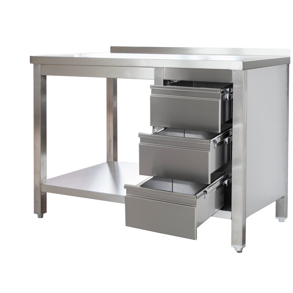 A&S Gastro Edelstahl Arbeitstisch mit Aufkantung und Schubladenblock rechts verschweißt | Bautiefe 800mm | mit : 1200 x 800 x 850 mm