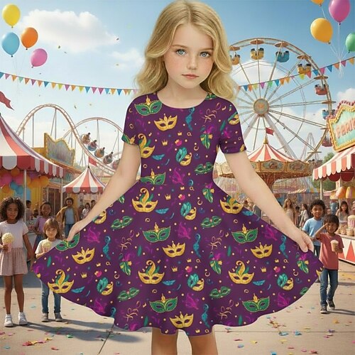 Carnevale ragazze' 3D Grafico Maschera Martedì grasso Abito Manica Corta Stampa 3D Estate Primavera Quotidiano Vacanza Feste Carino Essenziale Casual Bambini 4-12 Anni Vestito Casual Abito a trapezio