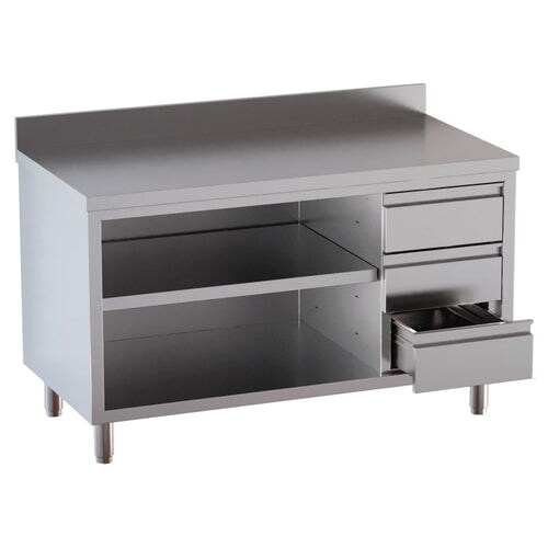 Edelstahl Arbeitsschrank offen, 3 Schubladen rechts mit Zwischenboden - alle Größen montiert: 100 x 70 cm / mit Aufkantung / fertig montiert