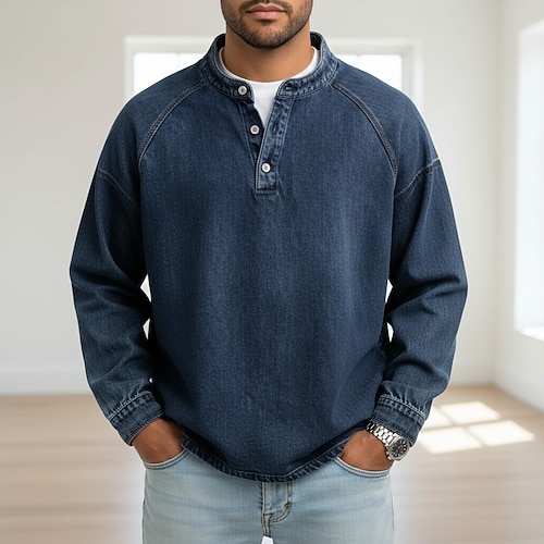 Per uomo Maglietta Maglia Henley Camicia di Jeans Camicia 100% cotone lavaggio acido Manica Lunga Semplice Vintage Streetwear Casual Lavato Manica corta Collo alla coreana Henley Casuale Streetwear