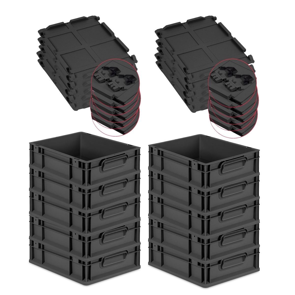 PROREGAL SuperSparSet 10x Eurobox NextGen Grip mit Scharnierdeckel & schwarzen Verschlüssen, HxBxT 12x30x40cm, 11L, Schwarz, Griffe zu, Eurobehälter