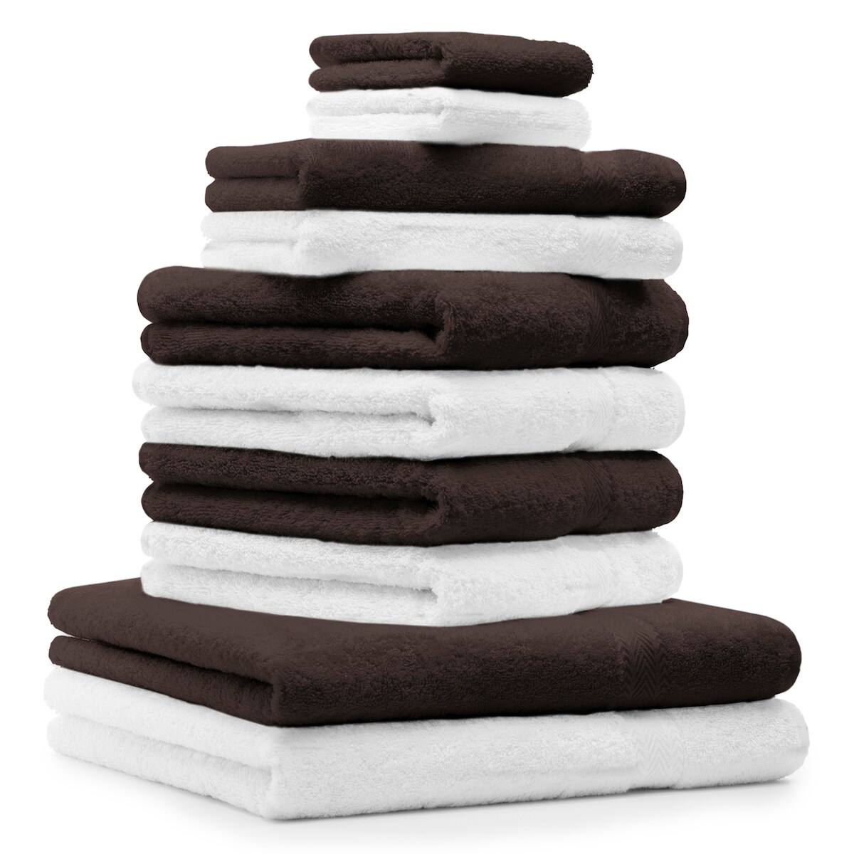 Betz 10-tlg. Handtuch-Set CLASSIC 100% Baumwolle 2 Duschtücher 4 Handtücher 2 Gästetücher 2 Seiftücher Farbe weiß und dunkelbraun